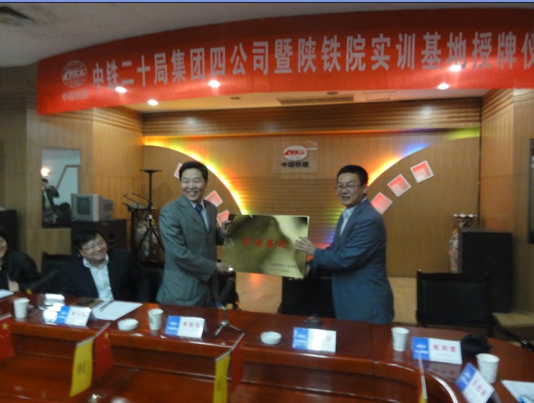 副经理焦胜军向中铁二十局四公司总经理肖红武授予校企合作实训基地牌匾