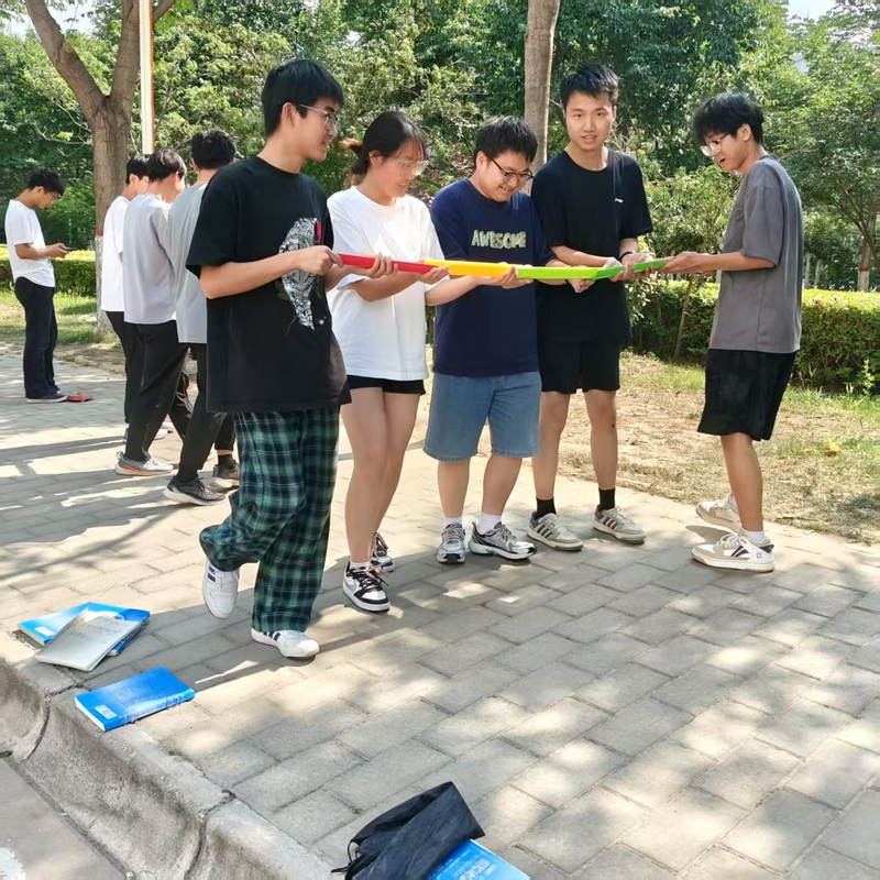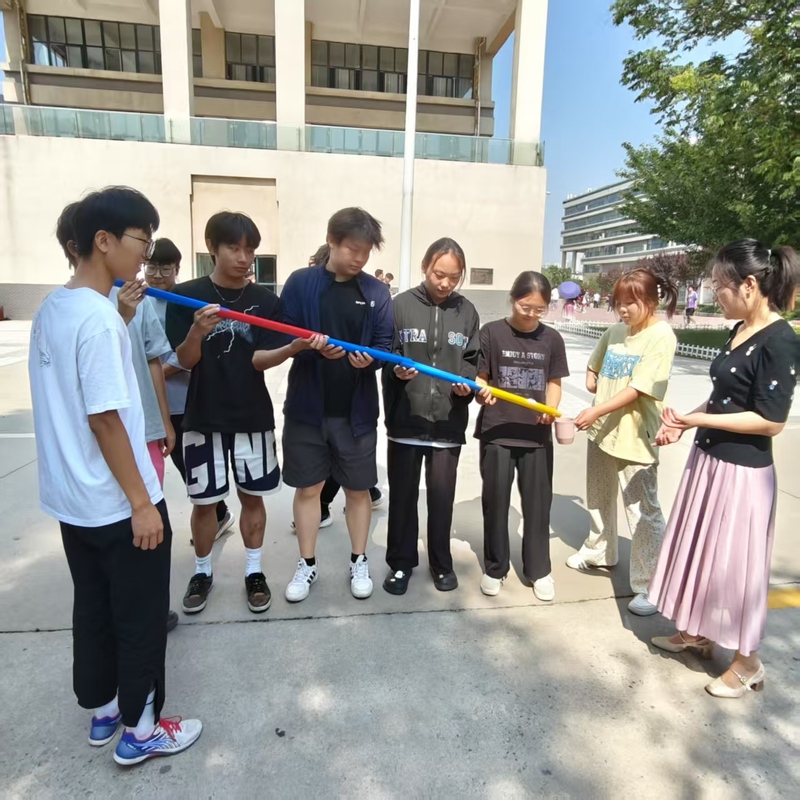 活动以“大风吹”游戏拉开序幕,活跃气氛,打破“小团体”并趁机分三组。随后“珠行万里”游戏是重头戏,所有队员在起点线后一字排开,每人手持一根球槽,将球放在第一个队员的球槽中,然后依次将球连续传动到下一个队员的球槽中,并迅速排到队伍的末端,继续传送前方队员传来的球,使球始终保持滚动状态,直至球安全到达指定的目的地。虽然起初因配合不够默契,珠子频频掉落,但在一次次尝试中,同学们逐渐掌握技巧,现场响起阵阵欢呼声,大家深刻体会到专注与默契的重要性。最后“多人多足”环节将活动推向高潮。同学们自由组队,用绑带将相邻队员的脚踝依次绑在一起,随着“一二一、一二一”的口号声,各队伍齐头并进,现场充满欢声笑语。