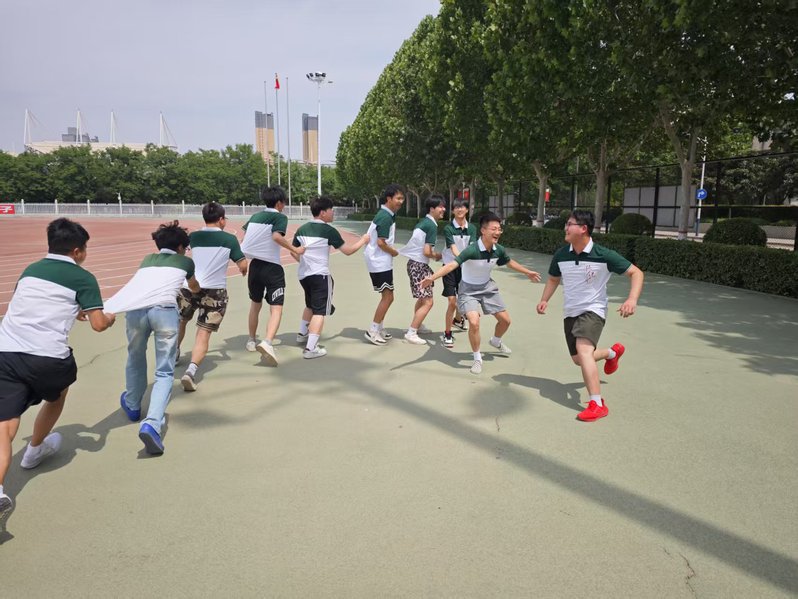活动伊始,“大风吹”游戏点燃热情,同学们端坐椅子,随着老师指令迅速反应,符合条件者起立,不符者做原地蹲起,现场气氛活跃。随后,“十人九足”考验团队协作,同学们用短绳绑腿,齐心协力从起点走向终点,欢声笑语中增进默契。最后,“老鹰捉小鸡”充满童趣,同学们在追逐中释放活力,感受快乐。