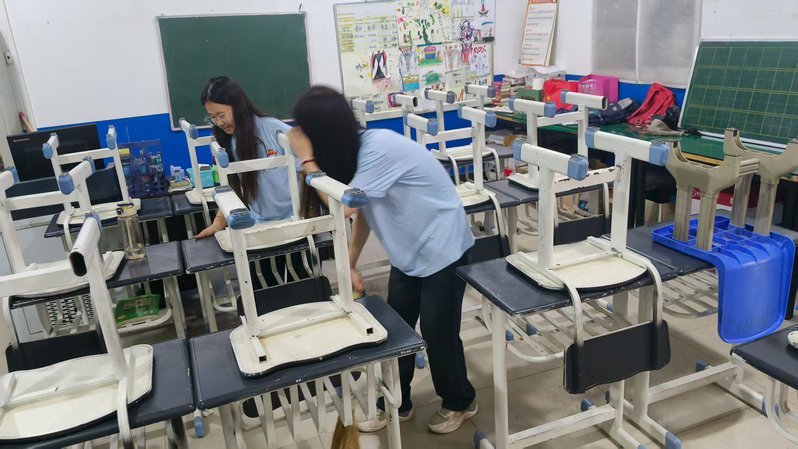 活动首日,志愿服务队迅速投入工作状态。在初步熟悉留守儿童之家的教室与活动区域后,队员们主动开展环境卫生整理工作。大家分工协作,清扫教室、整理图书,通过对细节的用心处理,为孩子们营造出更加整洁温馨的学习与生活空间。