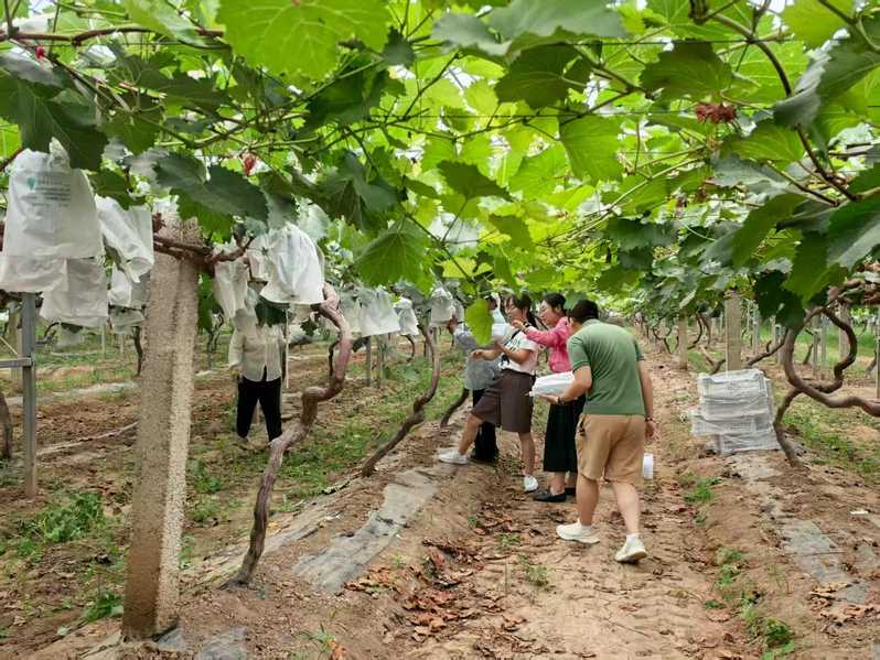 随后,队员们深入田间参与葡萄采摘实践。手持果剪挑选成熟果实的过程中,大家不仅体验了农耕劳作的辛劳,还与种植户深入交流,了解病虫害防治、节水灌溉等技术应用,以及产业园在品种改良、品牌打造上的创新举措。从葡萄种植到周边产品开发的全产业链探索,让队员们切实感受到特色产业对乡村经济的带动作用,为后续实践积累了鲜活案例。(杨果)